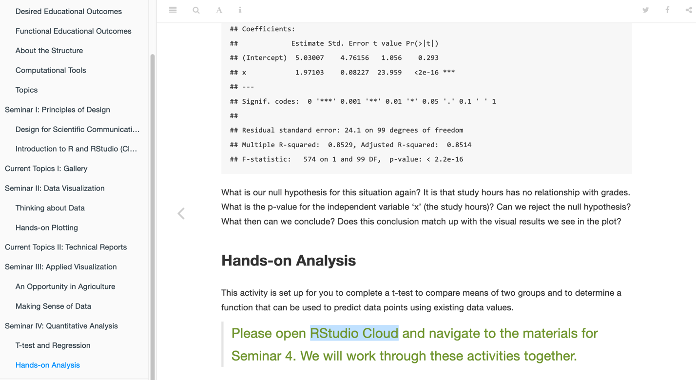 RStudio was leveraged to share data, perform analysis and provide visualization scripts. R Markdown files were created to integrate R code and instructional text. These files were then rendered as HTML files for display on the web. Students created personal RStudio.cloud accounts, and were then granted access to instructor-developed coding resources that they could edit and learn with their own copy of the code with no danger of overwriting the original source material. Students applied the instructor’s materials to their research projects then created original analyses and visualizations in the context of their unique synthetic biology context. This gave students the ability to integrate and display instructional text, related R code, and the output of the code such as plots and results of statistical analyses.